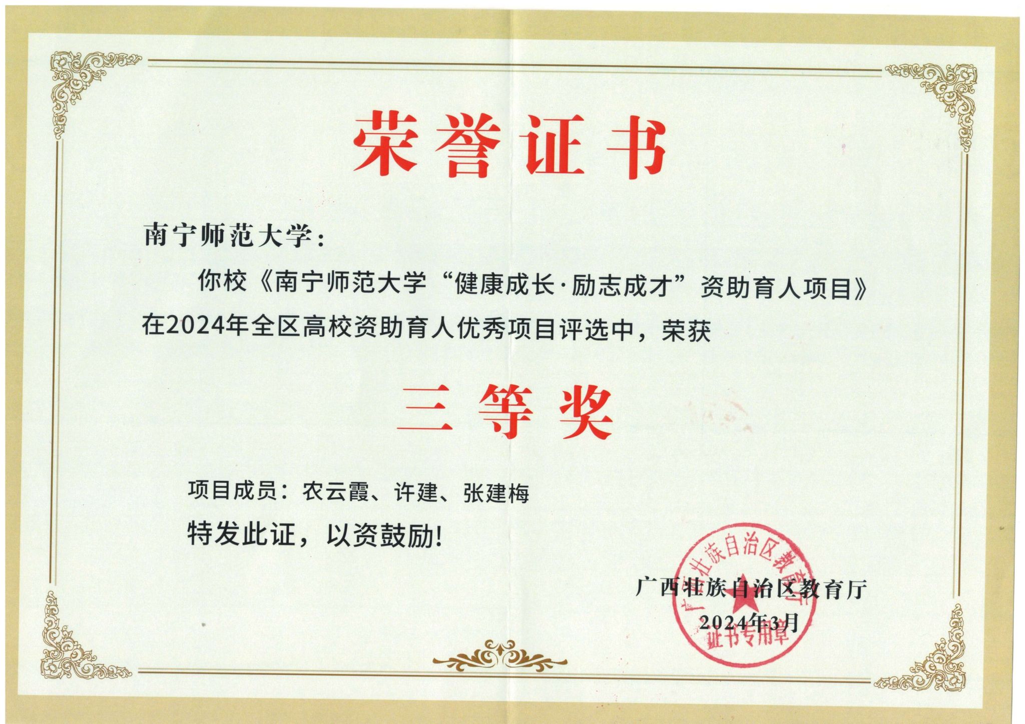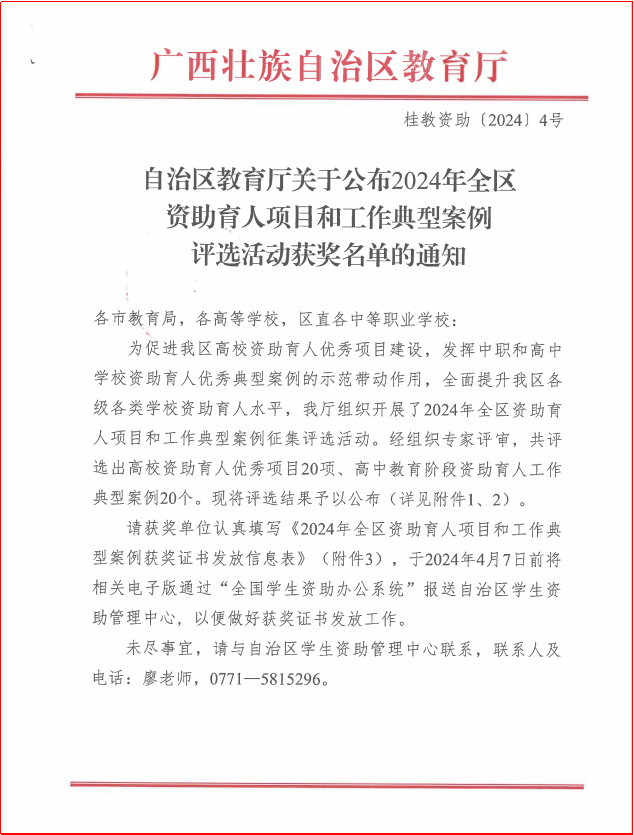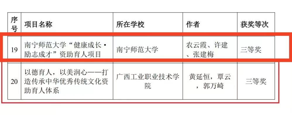 近日,自治区教育厅印发《关于公布2024年全区资助育人项目和工作典型案例评选活动获奖名单的通知》(桂教资助〔2024〕4号),在全区高校范围内共评选出资助育人优秀项目20项。我院农云霞、许建、张建梅申报的 “南宁师范大学’健康成长,励志成才’资助育人项目”荣获“2024年全区高校资助育人优秀项目”三等奖。