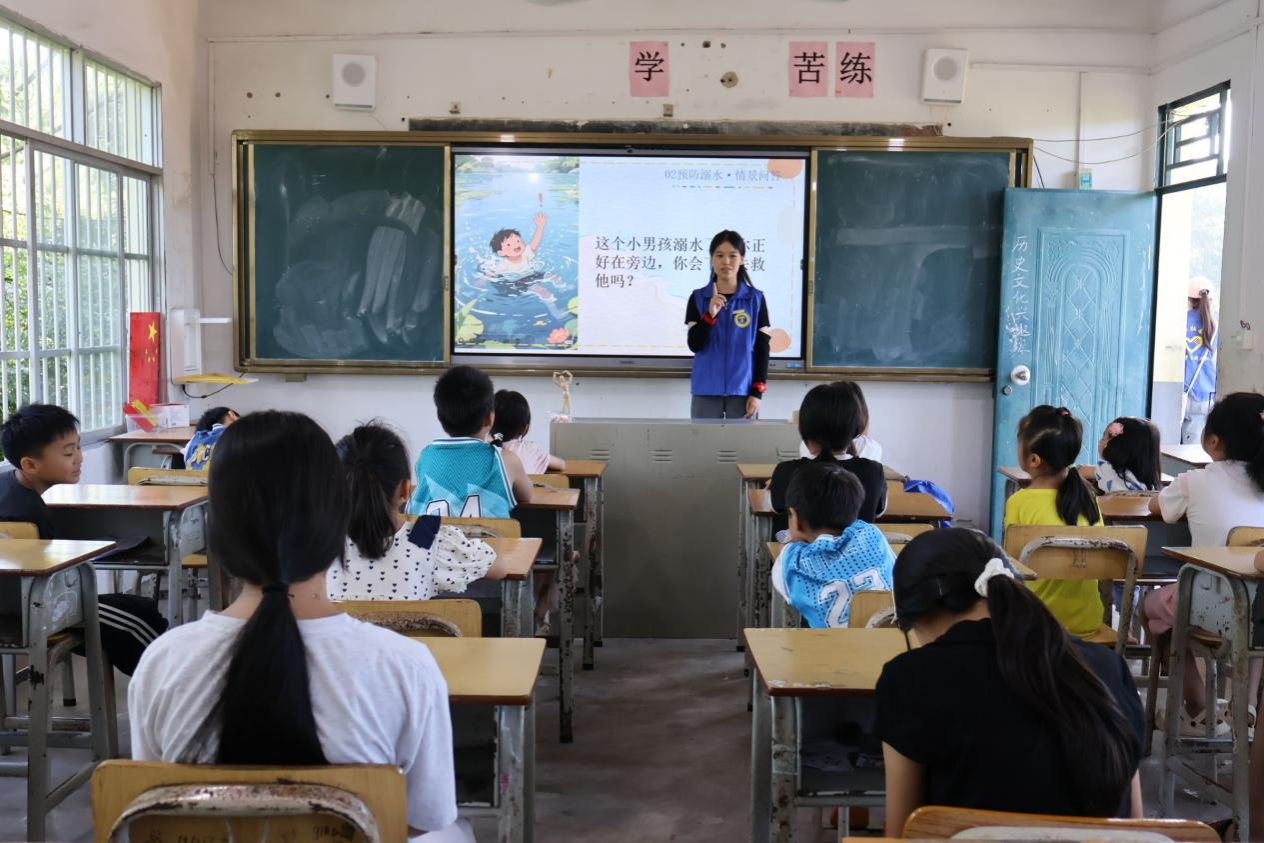 那么小学教室里,马万里首先向学生及村民介绍了暑期溺水事故防控形势随后由实践团何秋莹进行主讲,通过模拟演示溺水场景,用通俗易懂的语言讲解"六不准"防溺水原则,并现场演示救生器材使用方法。在急救培训环节,实践团李羽婷进行了逐步讲解和演示,30余名儿童在实践队员的指导下,分批次完成了急救知识实操练习,掌握胸外按压位置、力度和频率等关键要领。