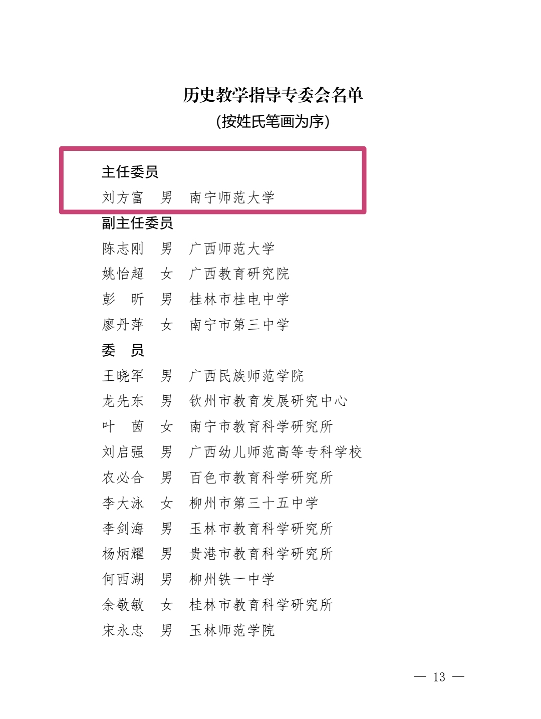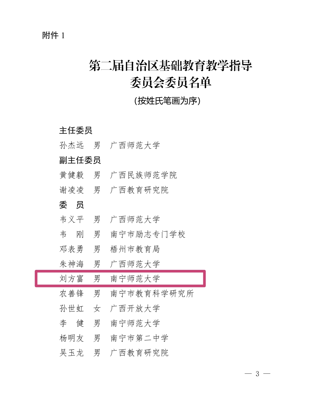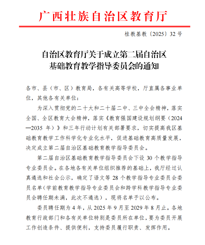 8月27日,自治区教育厅正式公布第二届自治区基础教育教学指导委员会及各专业委员会委员名单,我院3位教师成功入选。其中,刘方富老师获聘第二届自治区基础教育教学指导委员会委员,同时担任历史教学指导专委会主任委员;覃淮宇、黎曦两位老师获聘为专门教育指导专委会委员。聘期为2025年9月至2029年8月。