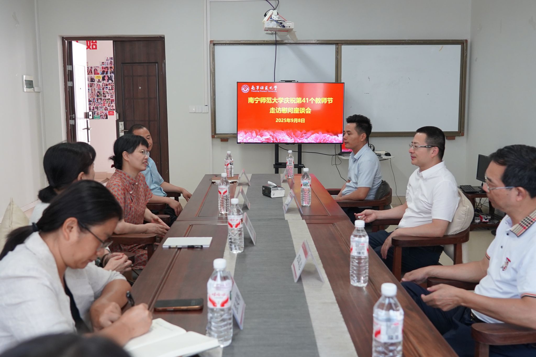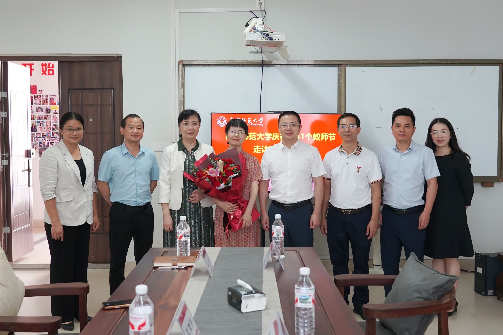 在第41个教师节来临之际,9月8日,学校领导王国红副校长带领人事处邓军彪处长、后勤基建处全广铭处长一行,到我院亲切看望和慰问优秀教师代表覃淮宇老师,送上鲜花、慰问金并致以节日问候和美好祝福。学院党委书记许建、副院长吴少进(主持行政工作)、党委副书记张建梅一同参与慰问活动。