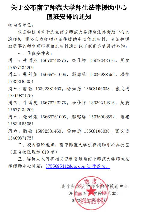 关于公布南宁师范大学师生法律援助中心值班安排的通知