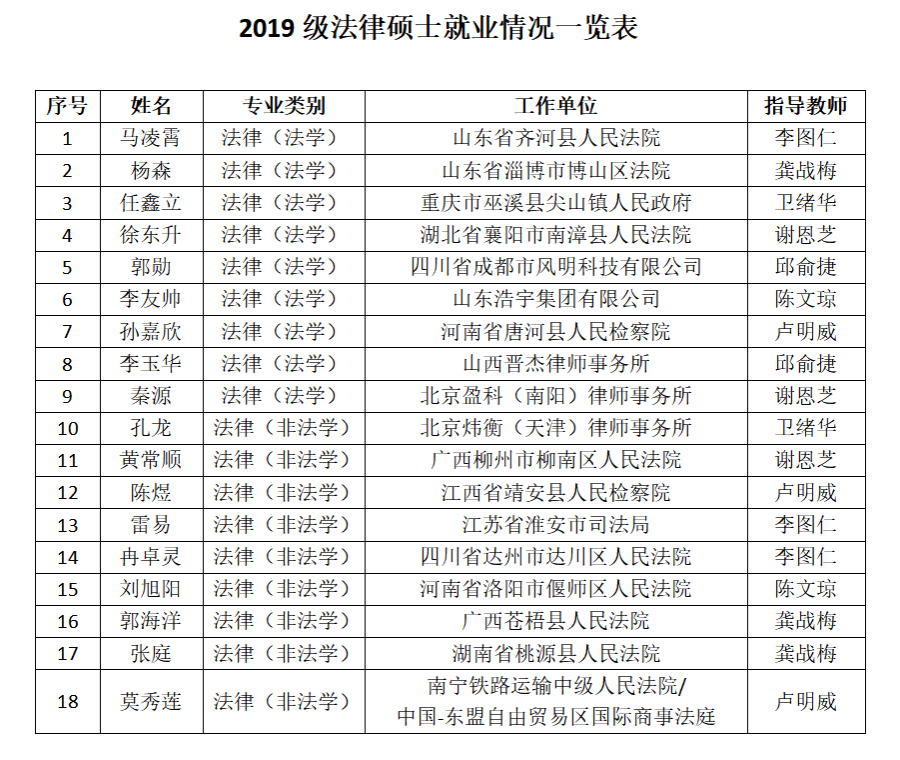 多年来,本学位授权点96%的学生在毕业前通过法律职业考试,多数毕业生就业去向为法院、检察院或律师事务所,就业单位与专业高度相关,保持着良好的就业质量。