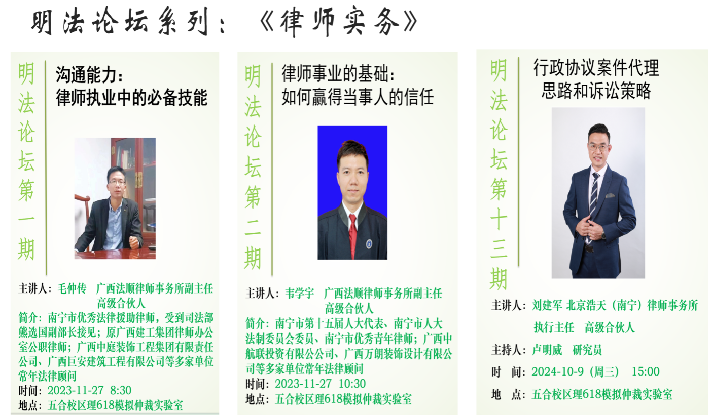 学位授权点拥有丰富的法律实践活动,学生将担任法律谈判的主谈人,担任模拟法庭的案件承办人,甚至担任南宁师范大学仲裁中心办案秘书,积累丰富的办案经验。
