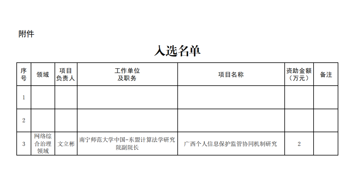 近日,自治区党委网信办公布了2025年度网信人才支持计划项目入选名单,由我院法律系文立彬副教授主持申报的项目《广西个人信息保护监管协同机制研究》入选全区网络综合治理领域项目。