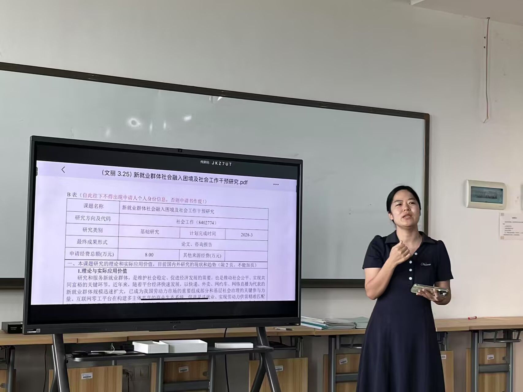 文丽老师对《新就业群体社会融入困境及社会工作干预研究》展开介绍。文老师分析了新就业群体社会融入困境研究的实际应用价值,她依据社会融入的理论基础,对新就业群体社会融入现状、困境表现及成因进行研究,为帮助新就业群体更好地融入社会提供了专业思路。