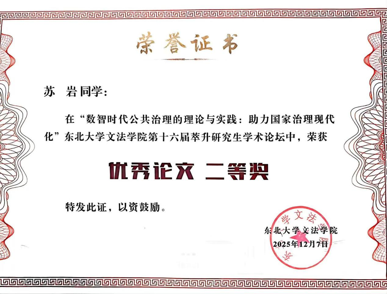 为深入学习贯彻习近平法治思想,聚焦“数智时代公共治理的理论与实践:助力国家治理现代化”这一核心议题,促进法学研究创新发展与高层次人才交流,东北大学于12月7日举办第十六届“萃升”研究生学术论坛。论坛汇聚全国多地高校专家学者和青年研究力量,共同探讨数字化变革背景下的国家治理与法治建设等前沿问题。我院2024级法律硕士研究生苏岩获本次学术论坛“优秀论文二等奖”,并受邀出席交流。