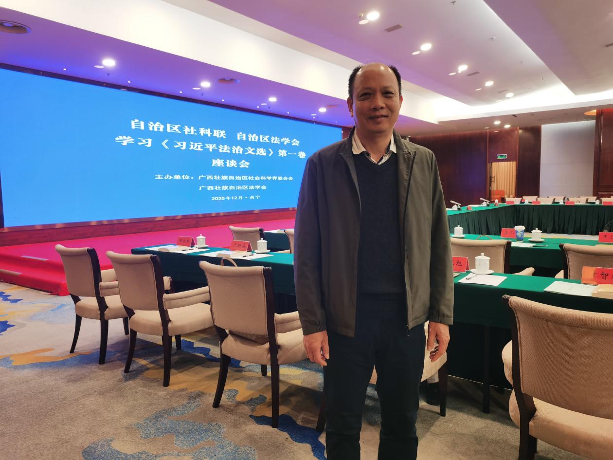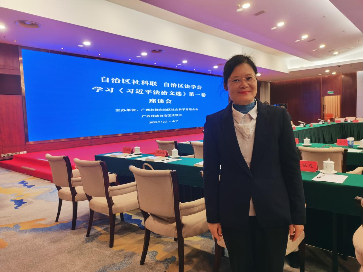 12月5日,《习近平法治文选》第一卷学习座谈会在南宁隆重召开。本次会议以深入学习贯彻习近平法治思想为核心,围绕《文选》的理论内涵、实践价值及新时代法治建设使命展开深入研讨。我院副院长卢明威研究员和法律系主任陈文琼教授受邀参会,与来自广西法学界的专家学者、实务界代表共商法治广西建设大计。