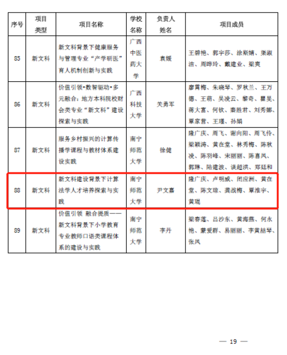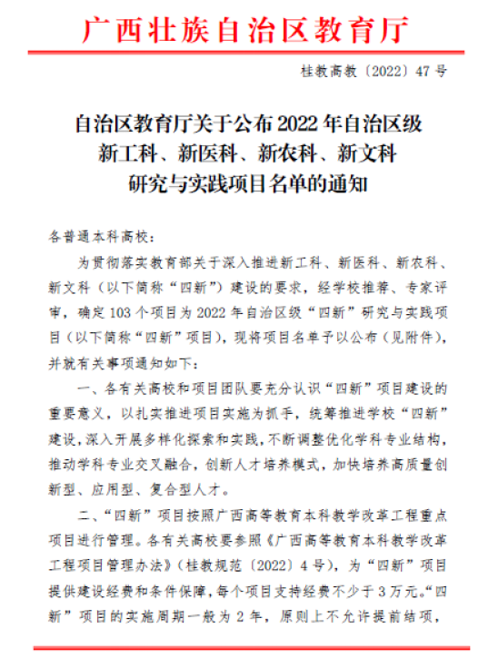近日,教育厅公布2022年自治区级新工科、新医科、新农科、新文科研究与实践项目名单的通知(桂教高教[2022]47号),我院《新文科建设背景下计算法学人才培养探索与实践》获得立项。这是我院高度重视新文科建设、积极以新文科建设为抓手推动学院教学改革的结果。