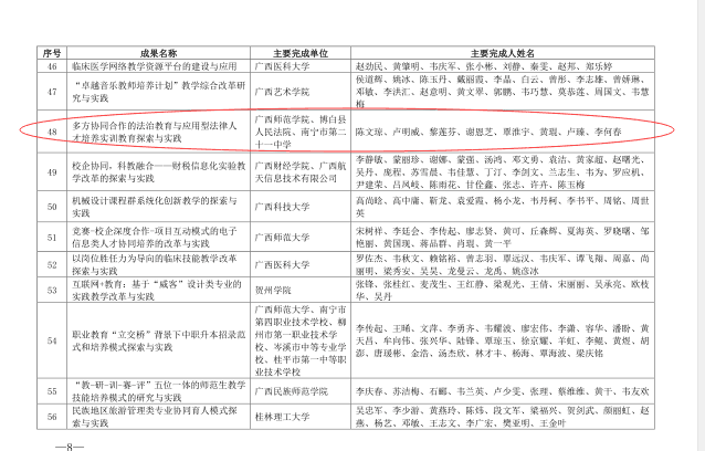 政法学院教学团队与博白县人民法院、南宁市第二十一中学联合申报的《多方协同合作的法治教育与应用型法律人才培养实训教育探索与实践》获广西师范学院教学成果奖特等奖、广西高等教育自治区级教学成果奖一等奖,这是探索多方协同合作的法治教育与应用型法律人才培养实训教育新模式的重要成果。