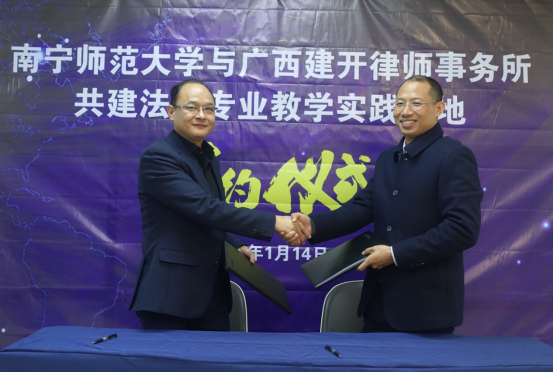 1月14日下午,我院与广西建开律师事务所共建法学专业教学实践基地签约揭牌仪式顺利举行。南宁师范大学法社学院尹文嘉院长、卢明威副院长、陈文琼(法律系)主任、张小华博士、文立彬博士和硕士研究生吴海潮、郭海洋、高雅婷,广西建开律师事务所吴顺国主任、覃卓君副主任、韦善鹏副主任等共同见证了签约揭牌仪式。