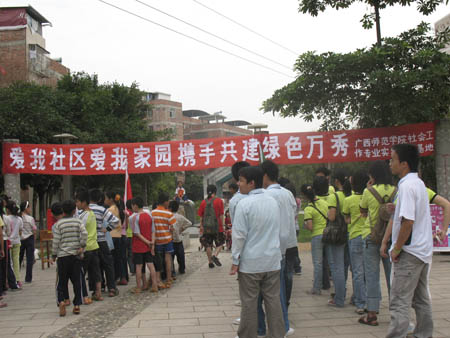 (记者:宋仔花、招冰) 在全球环境状况日益严峻的今天,“环保”已成为举世瞩目的焦点。为了进一步普及居民的环保知识,树立正确的环境价值观和环境道德风尚, 5月11日上午,政法学院社会工作专业的学生在西乡塘区万秀村明秀广场隆重举行组织了的题为“爱我社区爱我家园 携手共建绿色万秀”的环保宣传活动。在万秀社区的居住的中小学生也积极参加了该活动。