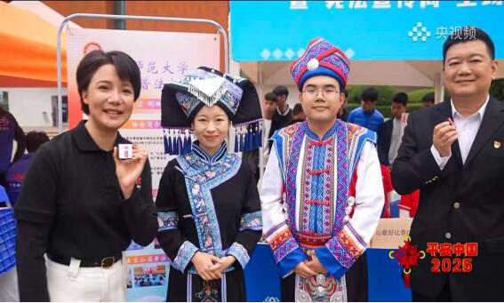 活动现场,央视频平安中国2025栏目组走进会场,来到南宁师范大学展台进行采访报道并在央视频等多个平台同步直播。协会负责人尹彭媛向记者介绍了金铜鼓普法协会的基本情况及主要活动类型。她表示,协会致力于将法律知识以群众喜闻乐见的形式传播到人民需要的地方,这一理念得到了现场记者及线上观众的一致认可,此次活动中,协会设计了“普法山歌挑战赛”和“扇间藏法”两个互动游戏,吸引了众多群众积极参与。本次活动将传统山歌文化与法治宣传相结合,既传承了地方特色文化,也有效提升了群众的法治意识。一位参与活动的群众表示;“没想到现在的大学生还喜欢山歌,把法律融进山歌里唱出来,感觉学法律也没那么难了”。