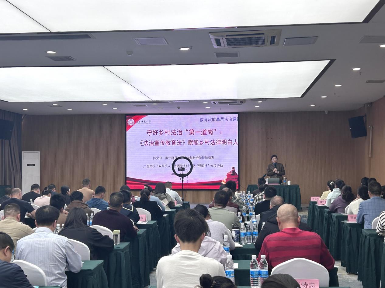 《法治宣传教育法》实施以来,广西以党建为引领,将“法律明白人”培育作为法治乡村建设的关键抓手,通过建强队伍、搭建平台、创新载体,让“法律明白人”成为传播法律知识、化解矛盾纠纷、服务乡村振兴的“生力军”,推动“办事依法、遇事找法、解决问题用法、化解矛盾靠法”成为乡村新风尚。我院法律系教工党支部作为广西高校“双带头人”教师党支部书记“强国行”专项行动团队,受邀为广西乡村法律明白人讲授《法治宣传教育法》对乡村法治宣传教育的意义。
